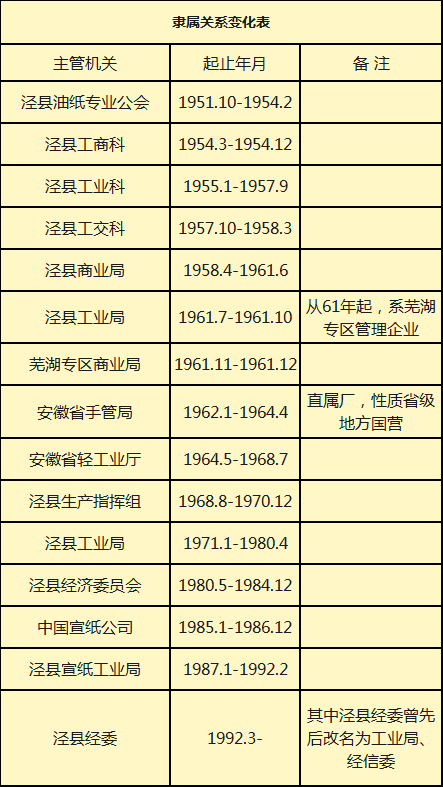因时代、体制等关系,其隶属关系也不断发生变化。宣纸联营期间,属于泾县管理。公私合营期间,泾县宣纸厂的隶属关系不断发生变化,1961年10月之前,先后为泾县工商科、公交科、商业局、工业局管理; 1961年11月,由芜湖专区商业局过渡,转至安徽省手管局管理; 1964年5月,转至安徽省轻工业厅管理。1966年,经安徽省轻工业厅批准,将“公私合营泾县宣纸厂”更名为“安徽省泾县宣纸厂”,属于省级地方国营性质;1968年8月,隶属关系改成泾县生产指挥所。至今,一直归属于泾县管理。