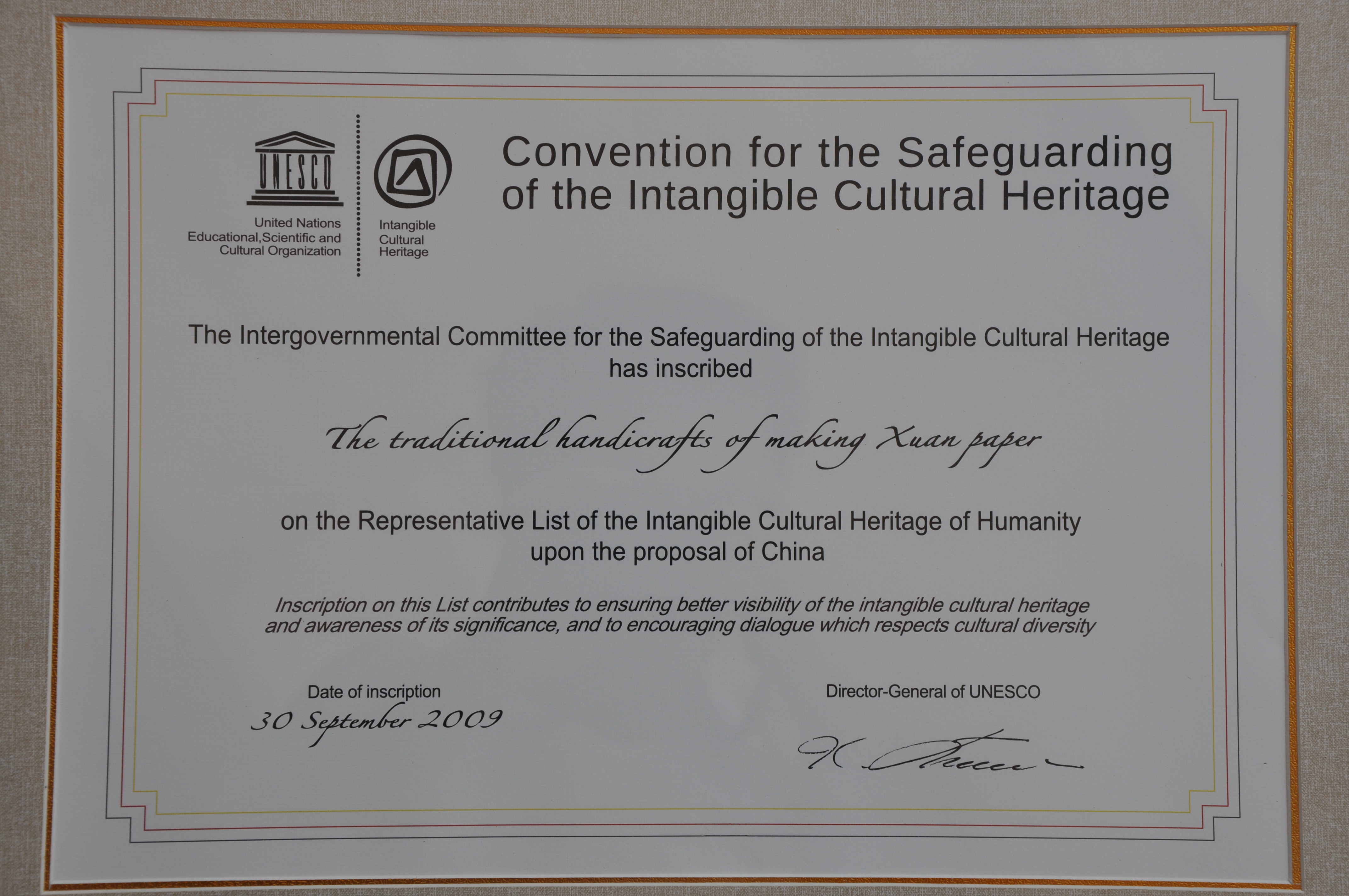 2009年9月30日,联合国教科文组织在阿联酋首都阿布扎比举行的政府间工作会议上,宣纸传统制作技艺与中国其余申报的21项被评审通过后正式公布为人类非物质文化遗产代表作。