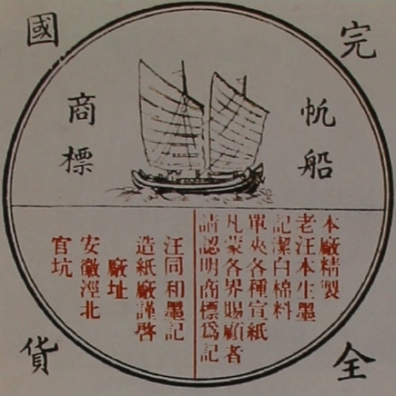 在企业使用商标时,一般都将企业名称与商标打捆使用,除了汪六吉外,还有朱同太、曹恒吉等。世袭时间久、另辟场地生产的企业又以不同的后缀以示区别,如:汪六吉墨记,曹洪昌承记、熙记,曹义发鸿记、云记、贺记、生记,曹恒源步记、桃记、秀记、栋记,曹恒吉南记、寿记,曹允源樵记、和记,曹宝聚郁记、忠记、龙记等。还有在外地开设的纸号、纸栈以名号区分,如九合号、永聚号、楚才夏记、六吉号、义合号、元记、玉记号、林一号、旭大号、开阳号等。一般都在产品的封刀口打上商标、企业名号印戳,加上印制的商标(形似广告册),以竹丝、箬叶为外包装打捆成件后打上标记以示区分。