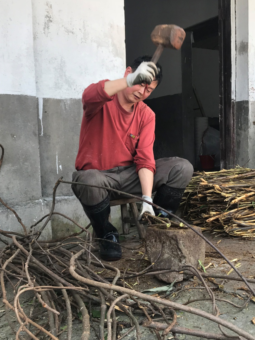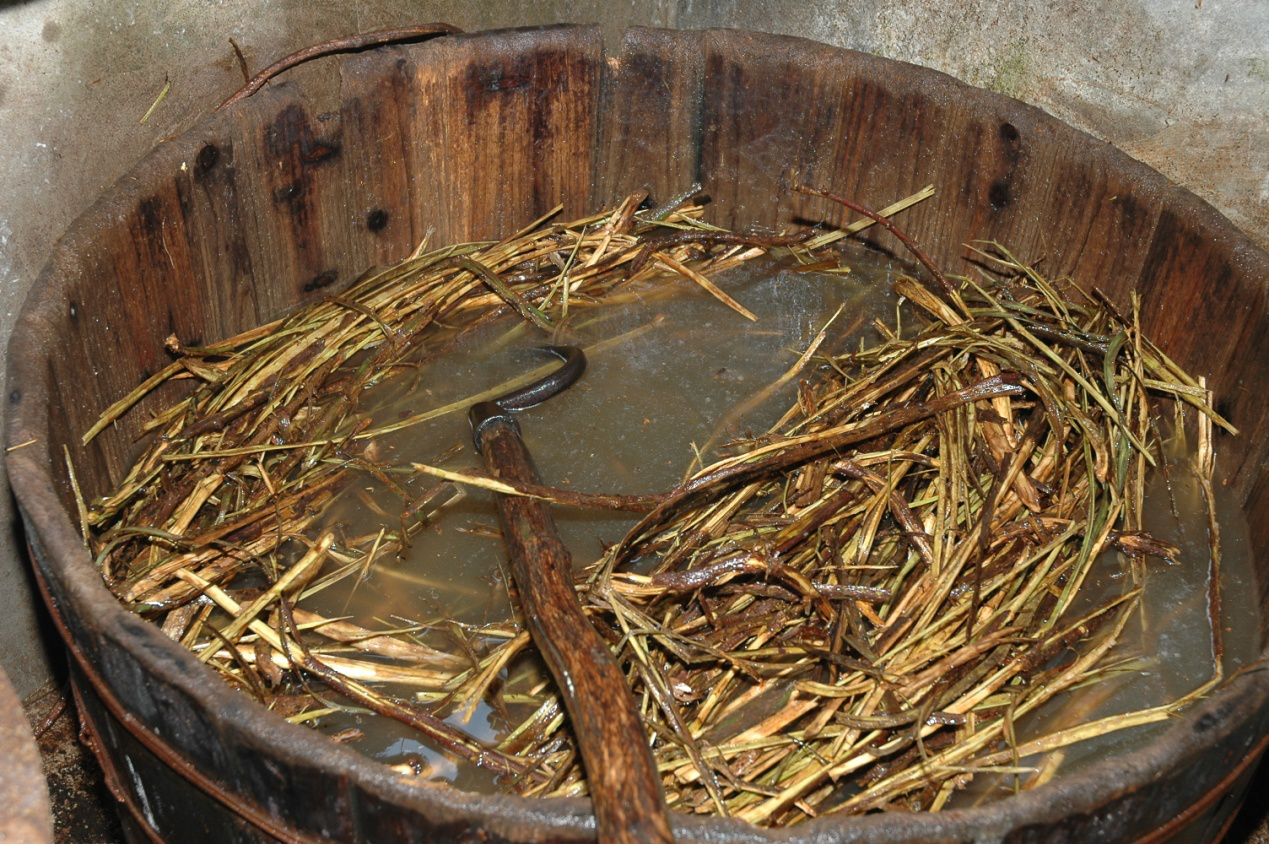 将适量的杨藤用手撅断成等分长短,用木槌锤破后全部浸泡池(桶)水中过夜,用弯钩拉动,药桶里的水牵丝后澄清用药袋过滤到药缸。