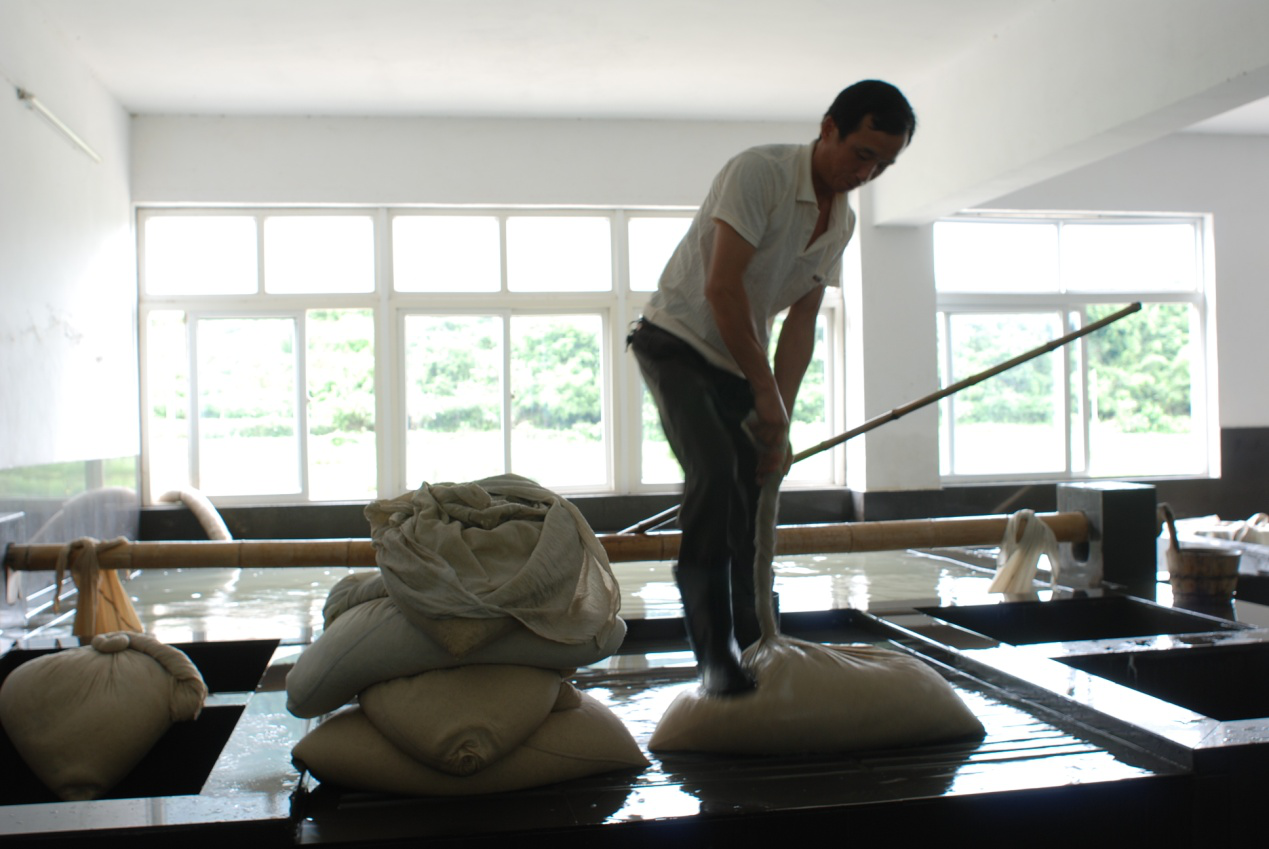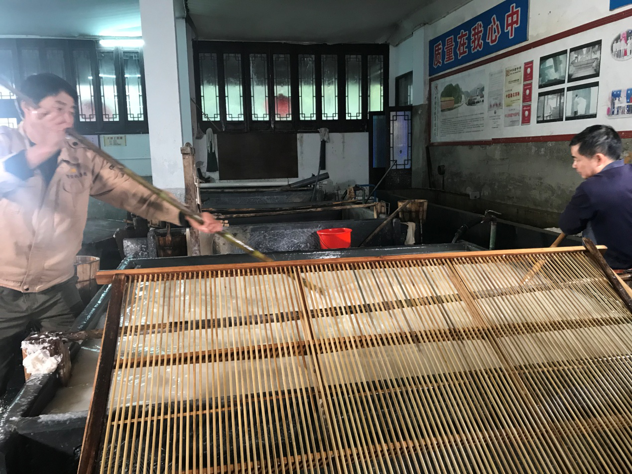 按槽口取料,将料放进槽内后,由捞纸抬帘工与划槽工分站纸槽两头,人要站丁字步,身体稍向前倾,双手持棍扒,左手在前撑稳,右手拉,其动作像磨磨一样,两人套起来搅拌,纸料搅拌好后,掺入药水,再用棍扒划匀,以免药花。