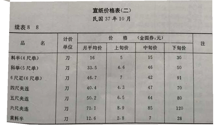 图 战争年代极不稳定的宣纸价格(《泾县志》1996版259页)