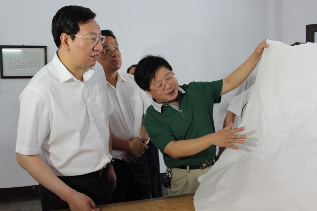 在参观过程中,曹部长详细了解了宣纸的传统制作过程以及独特的原材料,并亲自体验制作宣纸。胡文军董事长向就公司目前的发展状况以及下一步发展目标曹部长做了详细汇报。曹部长充分肯定了集团公司近年来所取得的发展成绩,并指出,宣纸的传统制作工艺,是人类非物质文化遗产,是全世界人民共同的精神财富,宣纸集团要充分发挥文房四宝行业龙头作用,要在保证宣纸质量的前提下着力提升产量,将传统的宣纸生产与文化旅游相结合,积极促进产业转型,实现产业化、集团化发展,为传承宣纸技艺、弘扬中华文化作更多更大贡献。