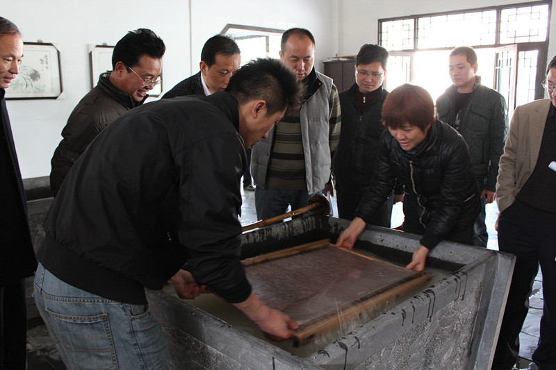 县政协领导一行首先听取了朱大国总经理对公司厂区改造、宣纸博物馆的设计蓝图等方面的介绍,随后参观了碓皮、切皮、捞纸、晒纸、检纸等宣纸传统制作工序。领导们每到一处,都细细观察,及时发问,认真地了解宣纸制作的各个过程。领导们表示,虽然自己已经不是第一次来文化园参观,但是每次来都会有新的感觉,切实感受到宣纸文化园在变化,在发展。