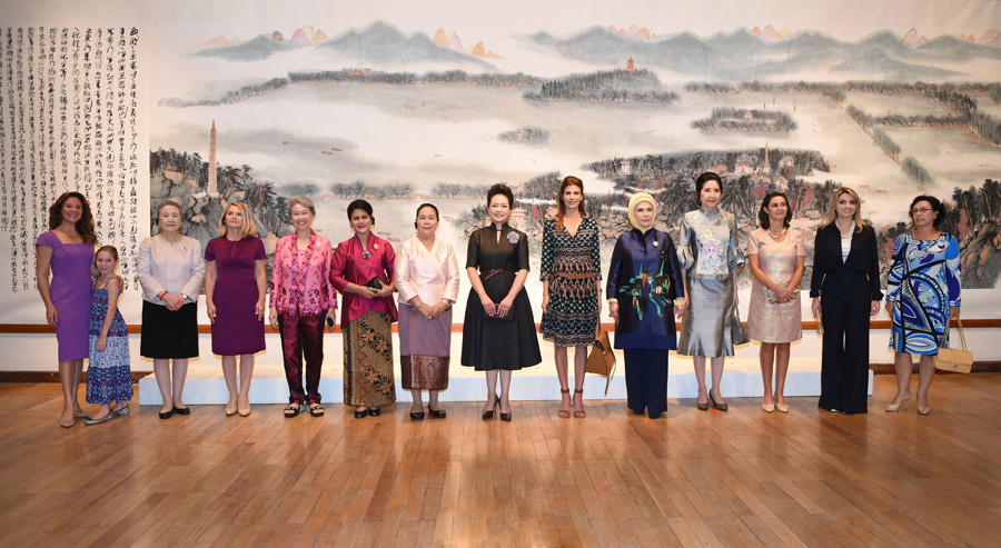 阿根廷总统夫人阿瓦达、印度尼西亚总统夫人伊莉娅娜、老挝国家主席夫人坎蒙、墨西哥总统夫人里韦拉、土耳其总统夫人埃米奈、加拿大总理夫人索菲、新加坡总理夫人何晶、泰国总理夫人娜拉蓬、欧洲理事会主席夫人玛乌格热塔、联合国秘书长夫人柳淳泽、世界贸易组织总干事夫人玛利亚、国际劳工组织总干事夫人卡琳娜等出席了参观活动。