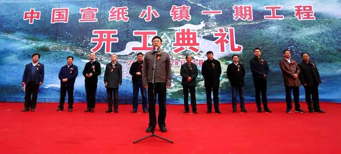 马文波致辞,他说,小镇的建成对于进一步保护和传承宣纸工艺、繁荣发展泾县文化旅游必将产生积极而重要的推动作用。他要求,县直有关部门和属地乡镇要坚持经济工作项目化、项目工作责任化,按照建设“四个泾县”、实施“五大会战”的工作要求,在项目落地、施工保障、配合协调上狠下功夫,为项目顺利建设提供有力支撑;施工单位要严格按照规范、科学施工,加快进度,确保工程质量。