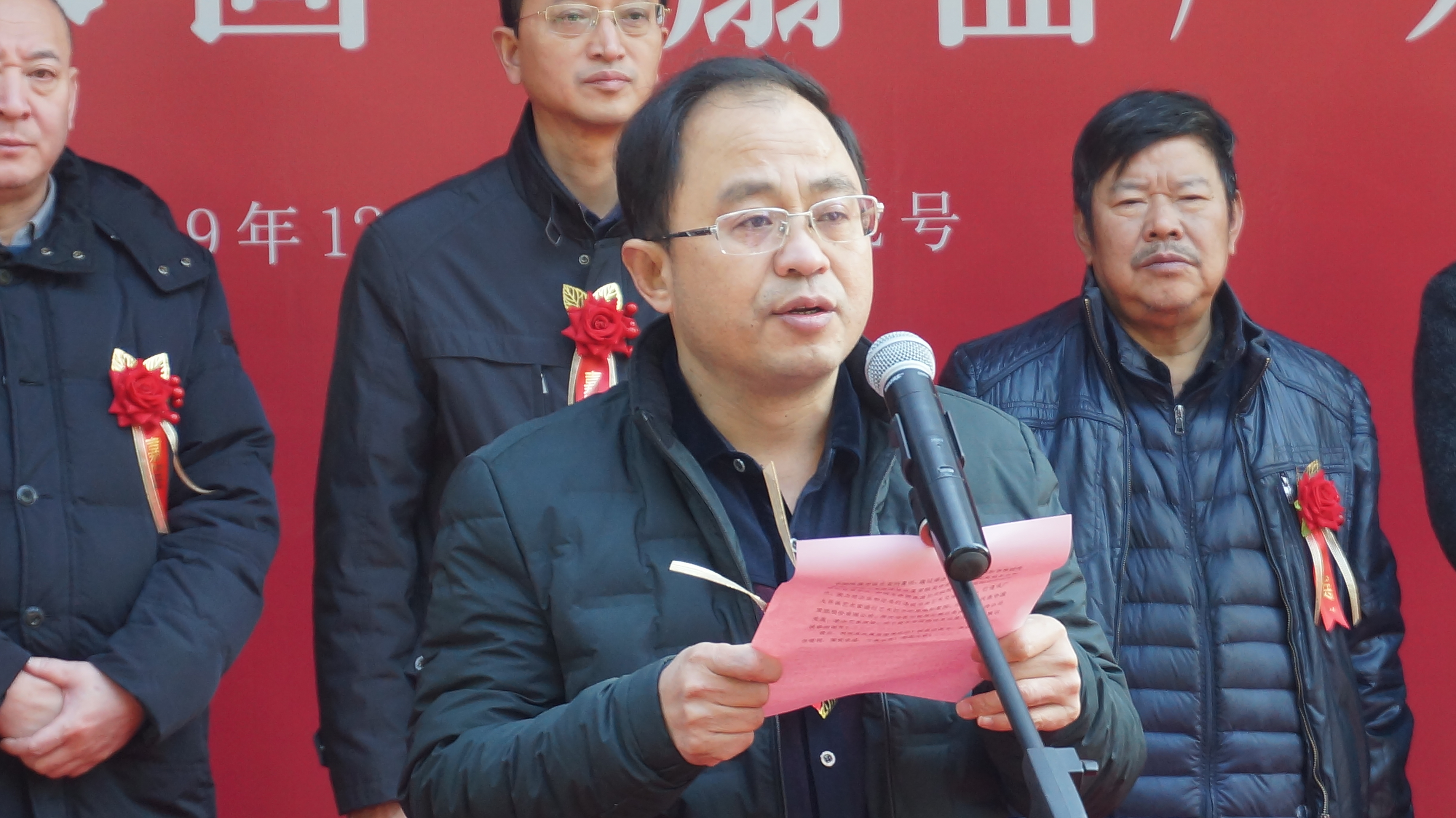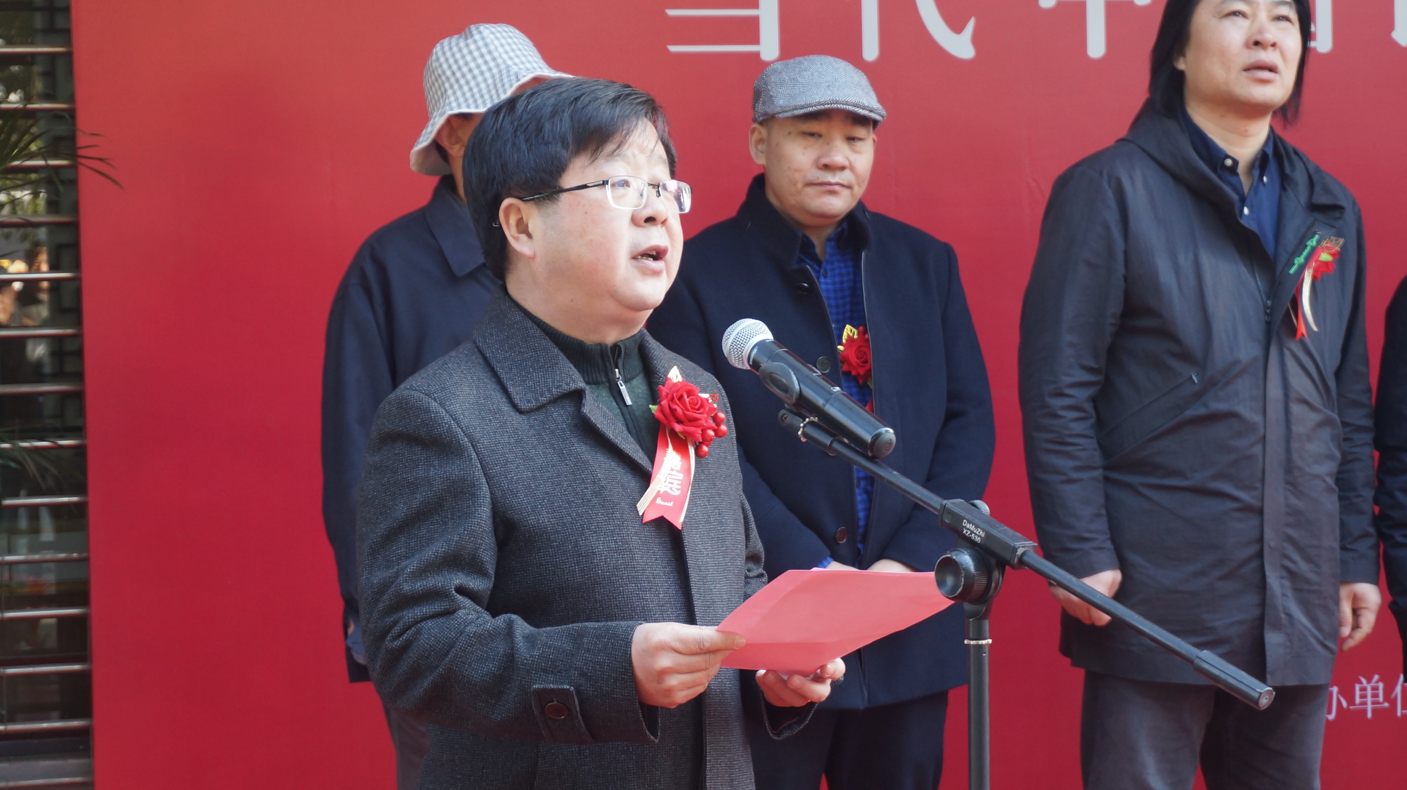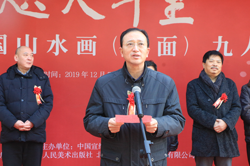 泾县人民政府副县长、公安局长冯晓尧代表泾县县委、人民政府对展览的成功举办表示祝贺,并且说到此次九人展是各位艺术家践行习近平新时代中国特色社会主义思想和十九届四中全会精神,推动书画艺术和宣纸文化融合发展的创新之举;是各位艺术家深入基层,扎根生活,走进泾县,把最好的精神食粮奉献给泾县人民的惠民之举,充分体现了大家对泾县、对宣纸的深厚情谊,是我县文化事业发展的一件大事、喜事。衷心地希望各位领导、各位艺术家,常来泾县的绿林、花海、竹涛中转一转,问一问泾县的鸟语花香、品一品泾县的人文山水、走一走泾县的茶马古道,用你们手中的妙笔,在泾县的宣纸上,画出最美好的画卷。