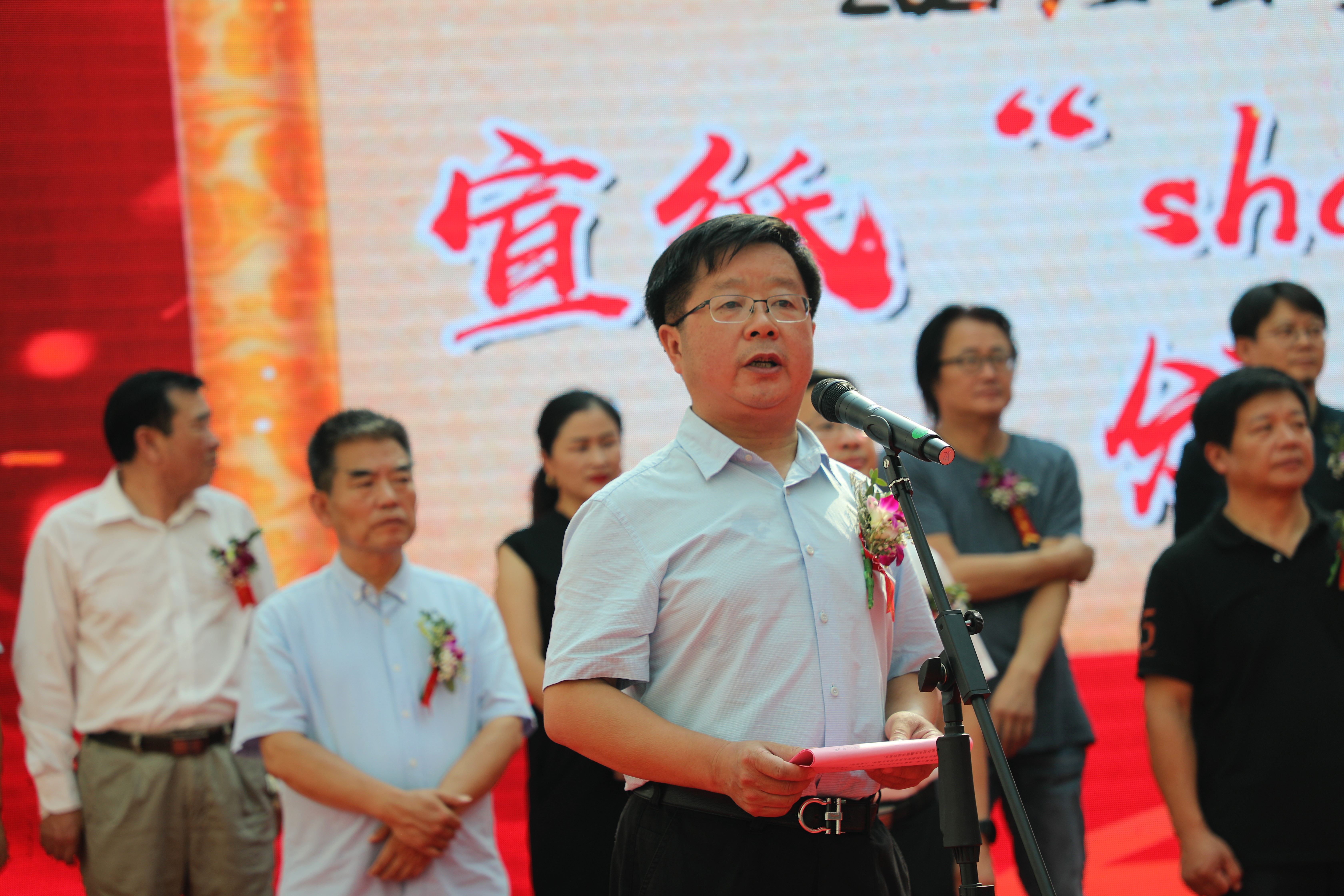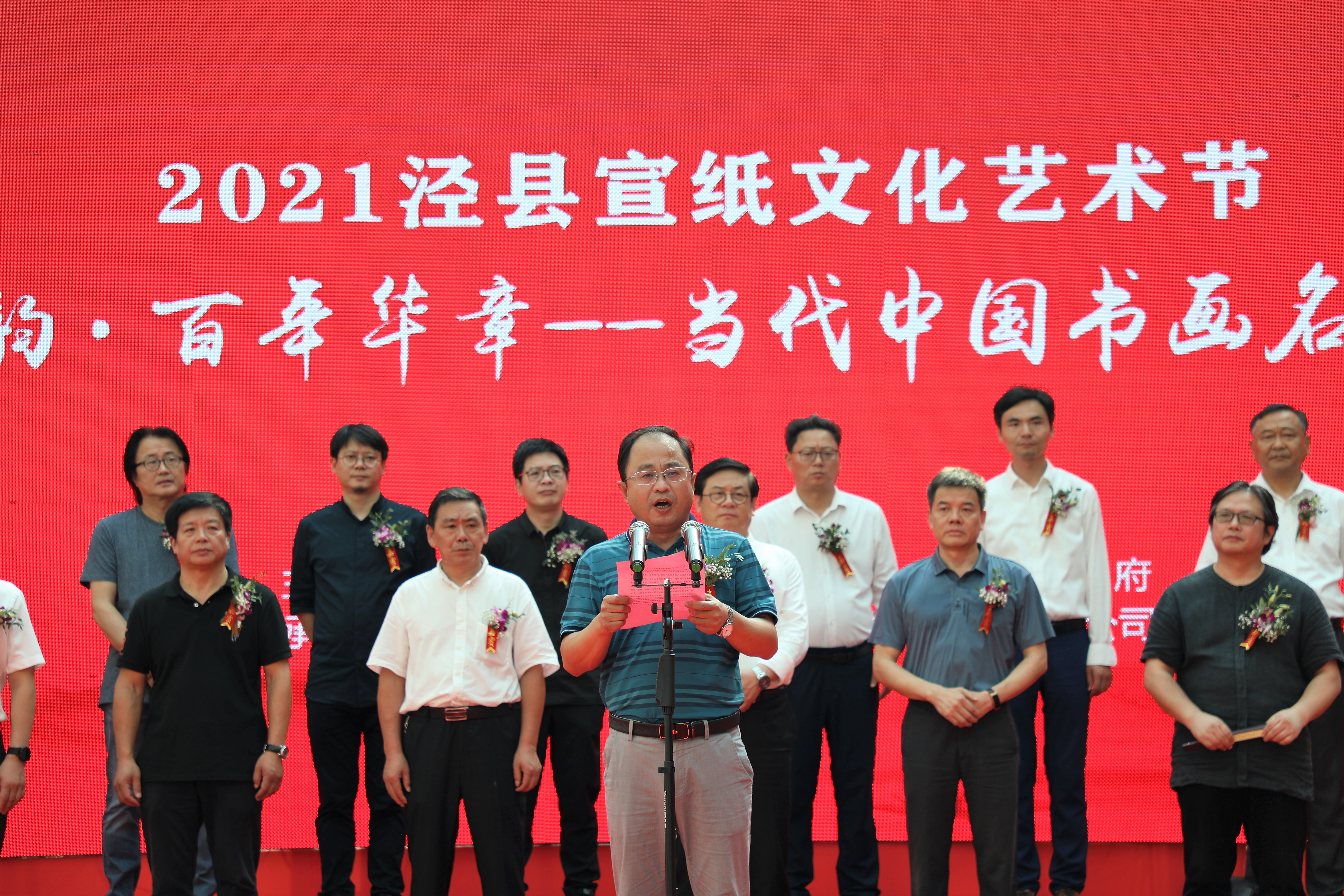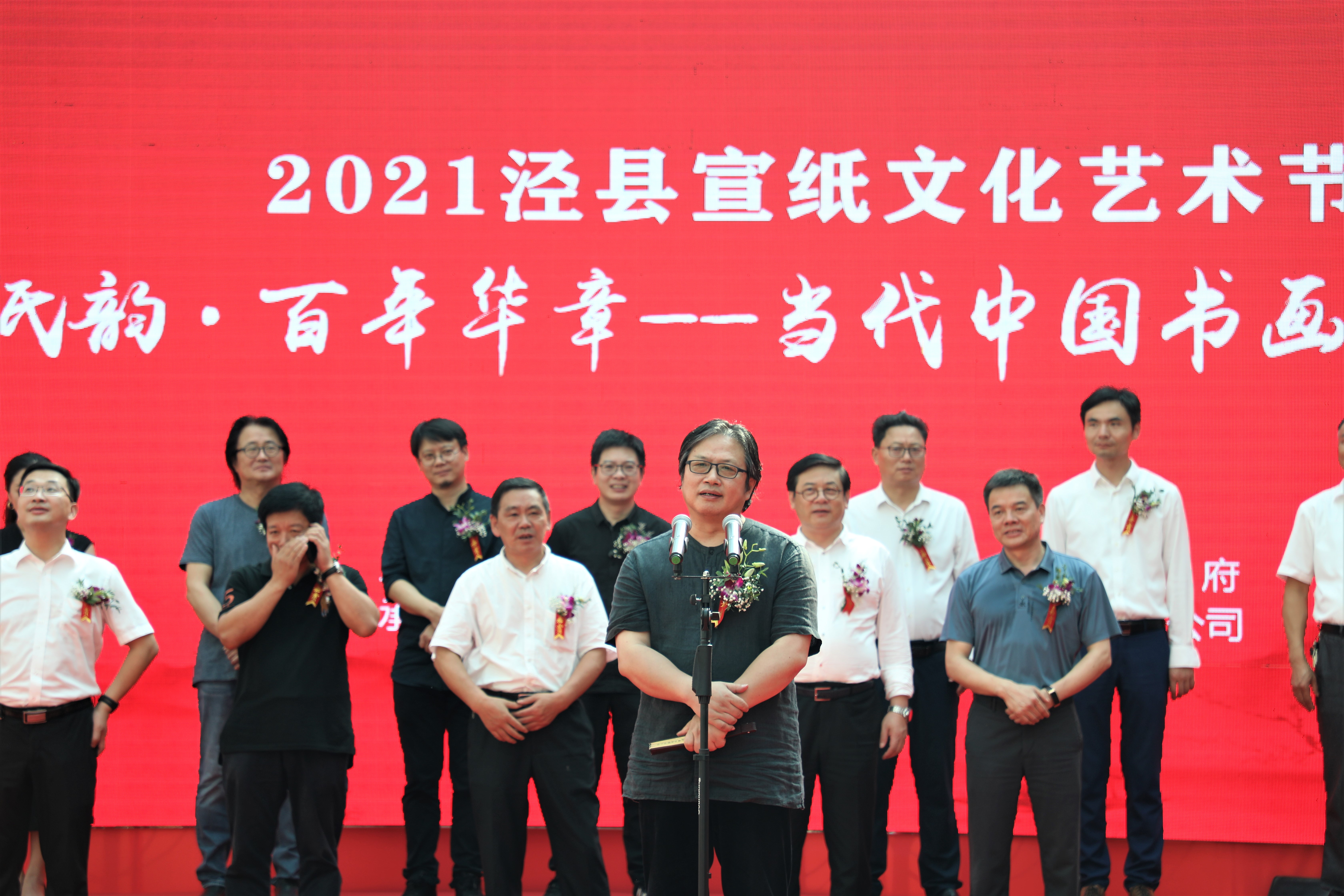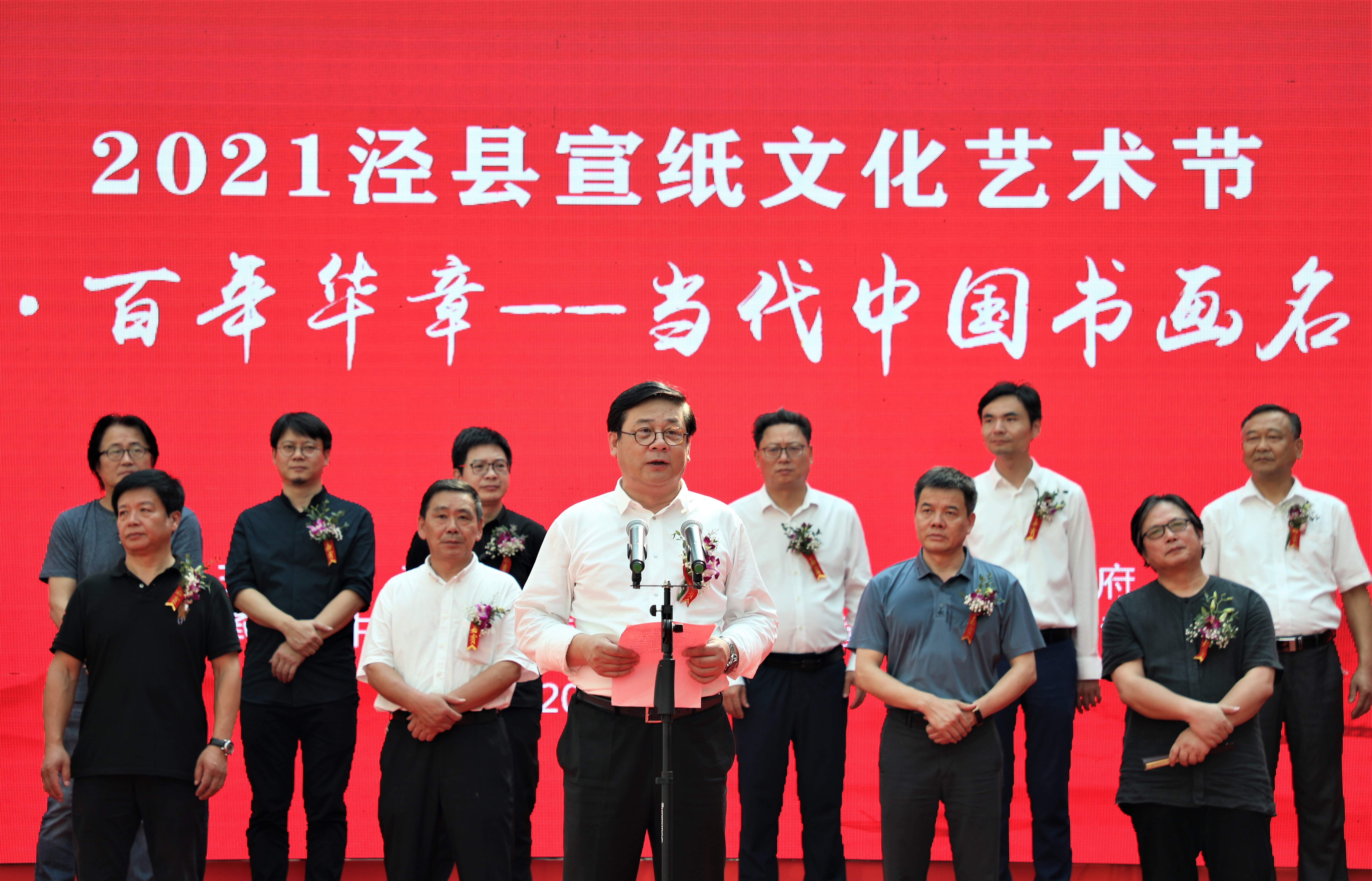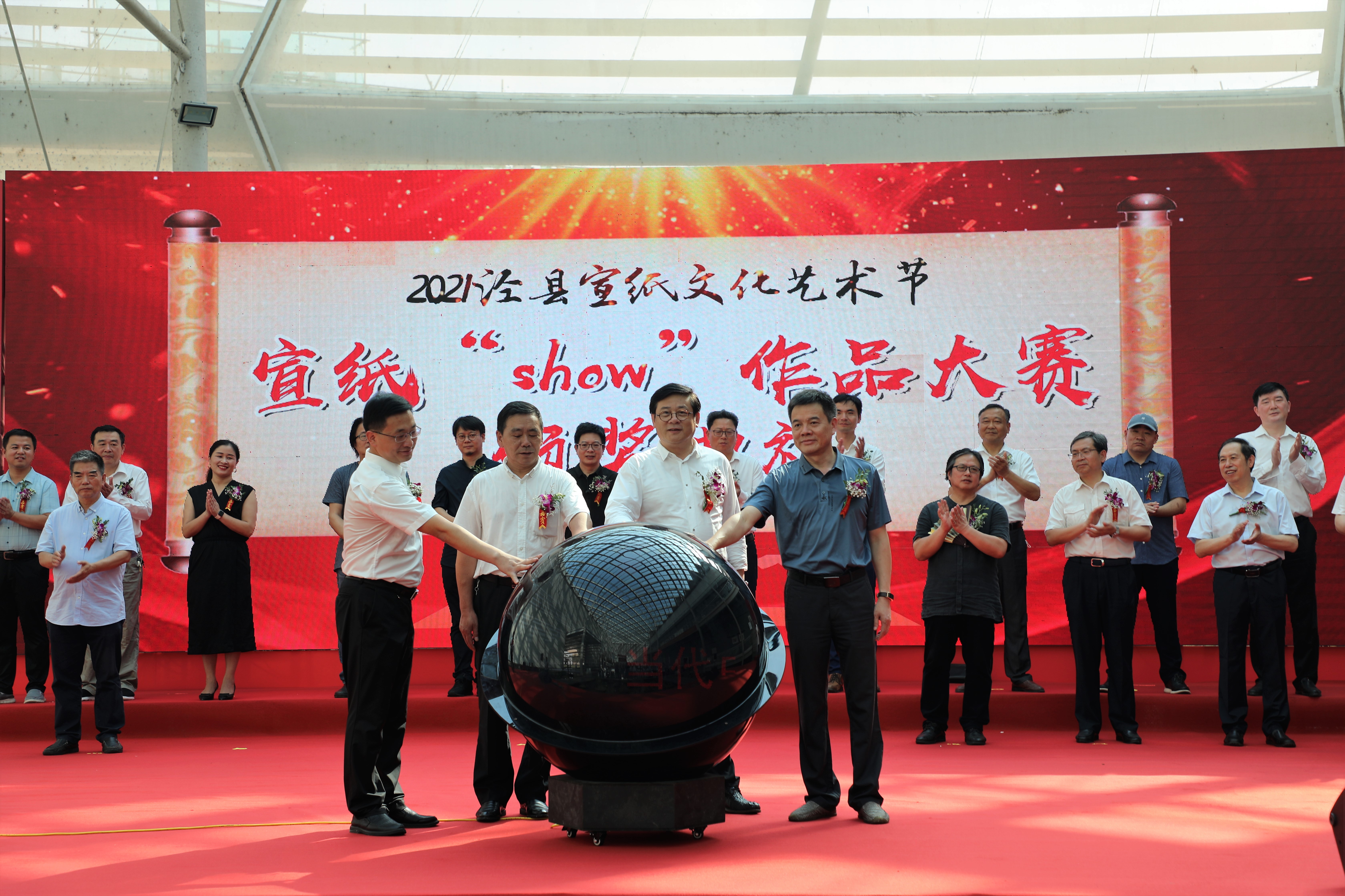 中国美术家协会分党组书记、驻会副主席徐里,市人大常委会副主任张光勇,市政协副主席宦朝东,县委副书记钱会等四位领导、嘉宾按动启动球,标志着“千载纸韵·百年华章——当代中国书画名家邀请展”暨宣纸SHOW作品展正式开幕。