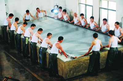 (◆ 18名熟练捞纸工人合作捞纸。)