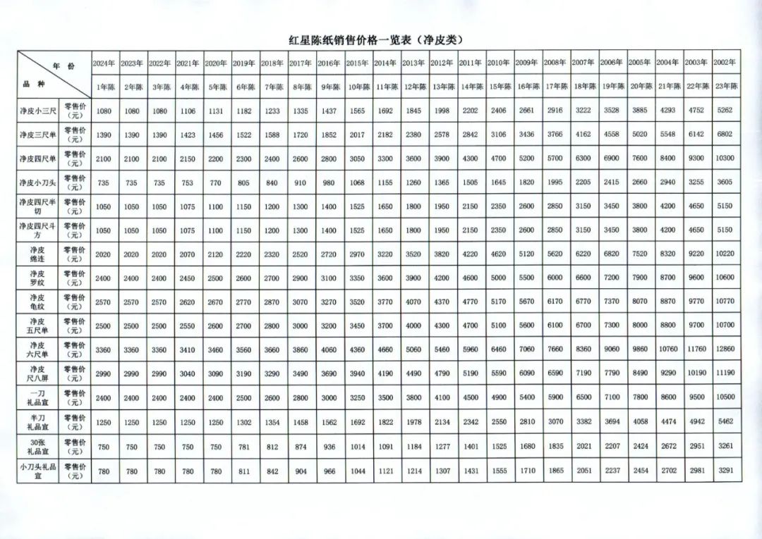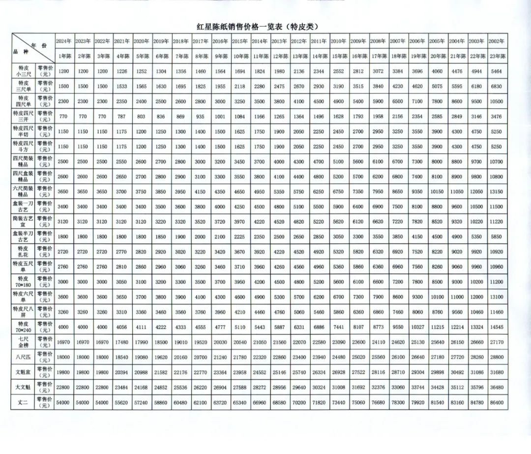 红星陈纸近年来受到书画市场的一致认可,具有较高的市场接受度,但由于定价体系不科学,相关销售渠道价格难以统一,造成陈纸市场目前比较混乱,实际成交额不高,为进一步规范红星陈纸销售,避免各经销渠道之间的无序竞争,维护好红星陈纸市场。公司对红星陈纸销售价格进行了统一规定,请广大消费者悉知。