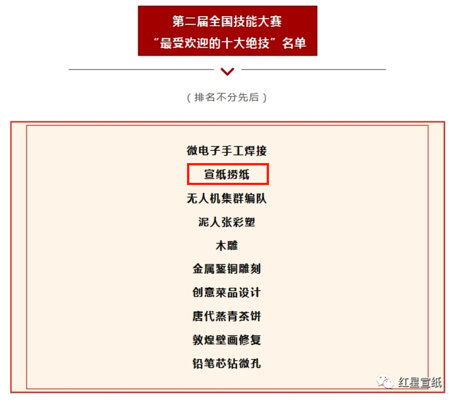 第二届全国技能大赛,于9月16日至19日在天津举办。其中“宣纸捞纸”荣获“最受欢迎的十大绝技”之一。