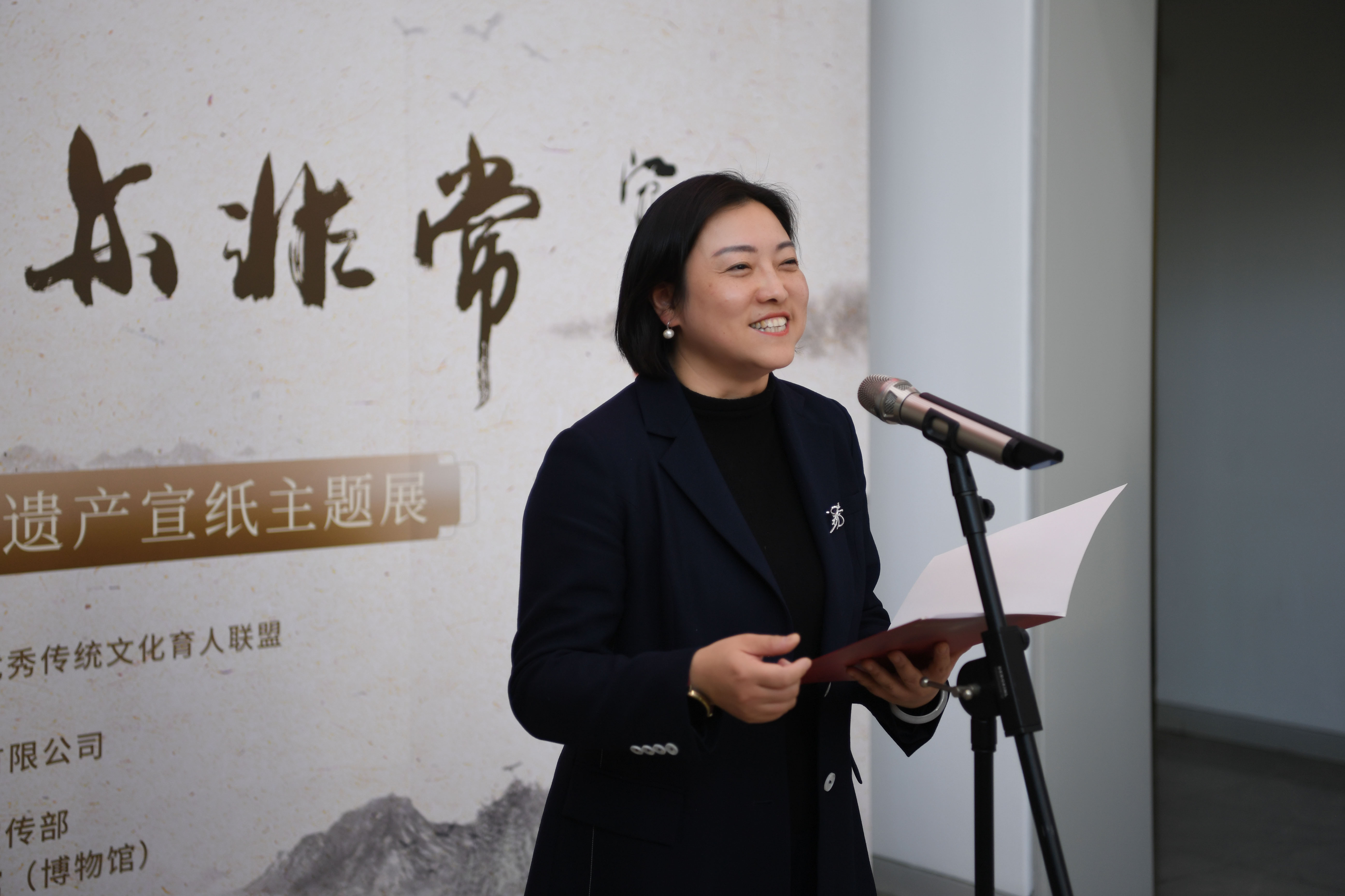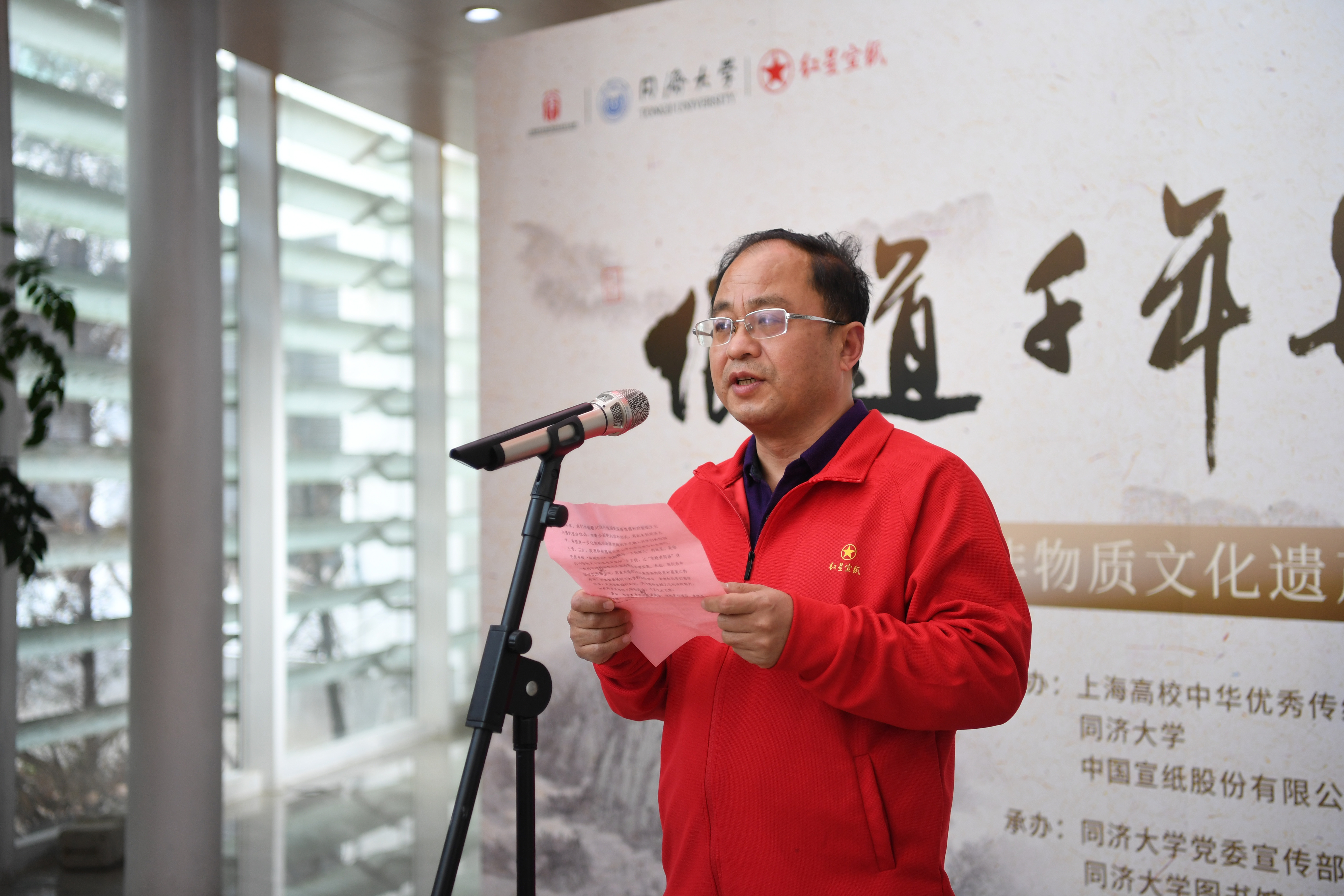 同济大学党委副书记曹静致辞,她首先对各位来宾表示热烈欢迎,对精心筹备本次展览的各位工作人员表示衷心的感谢,她表示学校深入学习贯彻落实习近平文化思想,牵头成立上海高校中华优秀传统文化育人联盟,通过丰富多样的活动推动传统文化的创造性转化与创新性发展。她强调纸的文明史,是一部中华民族“观天法地、格物致知”的科技史,更是一部“以文化人、以美育人”的精神史。让我们在领略宣纸魅力的过程中,不断坚定文化自信,为传承弘扬中华优秀传统文化凝聚精神力量,为建设中华民族现代文明这一新时代新的文化使命贡献高校力量!