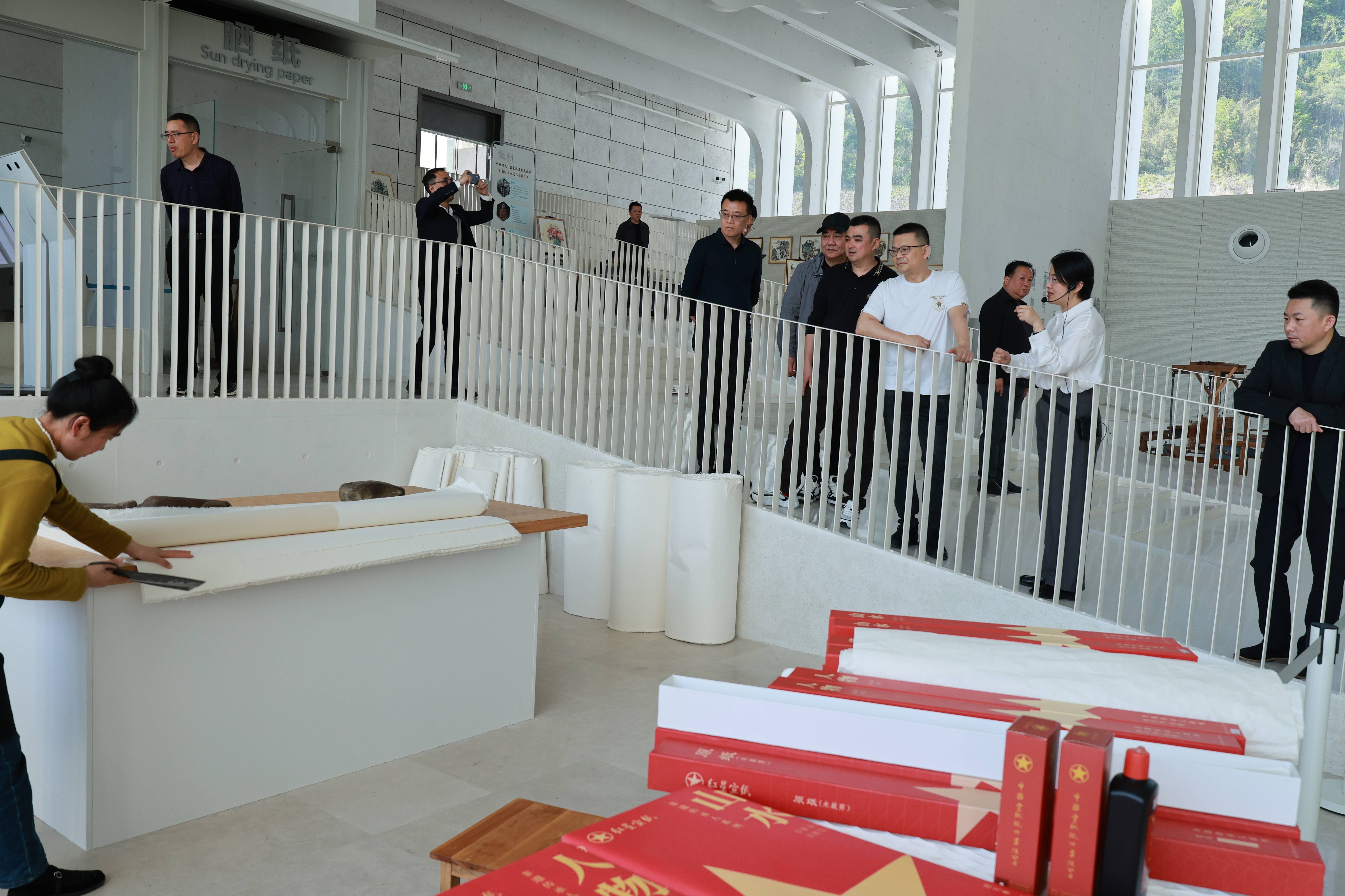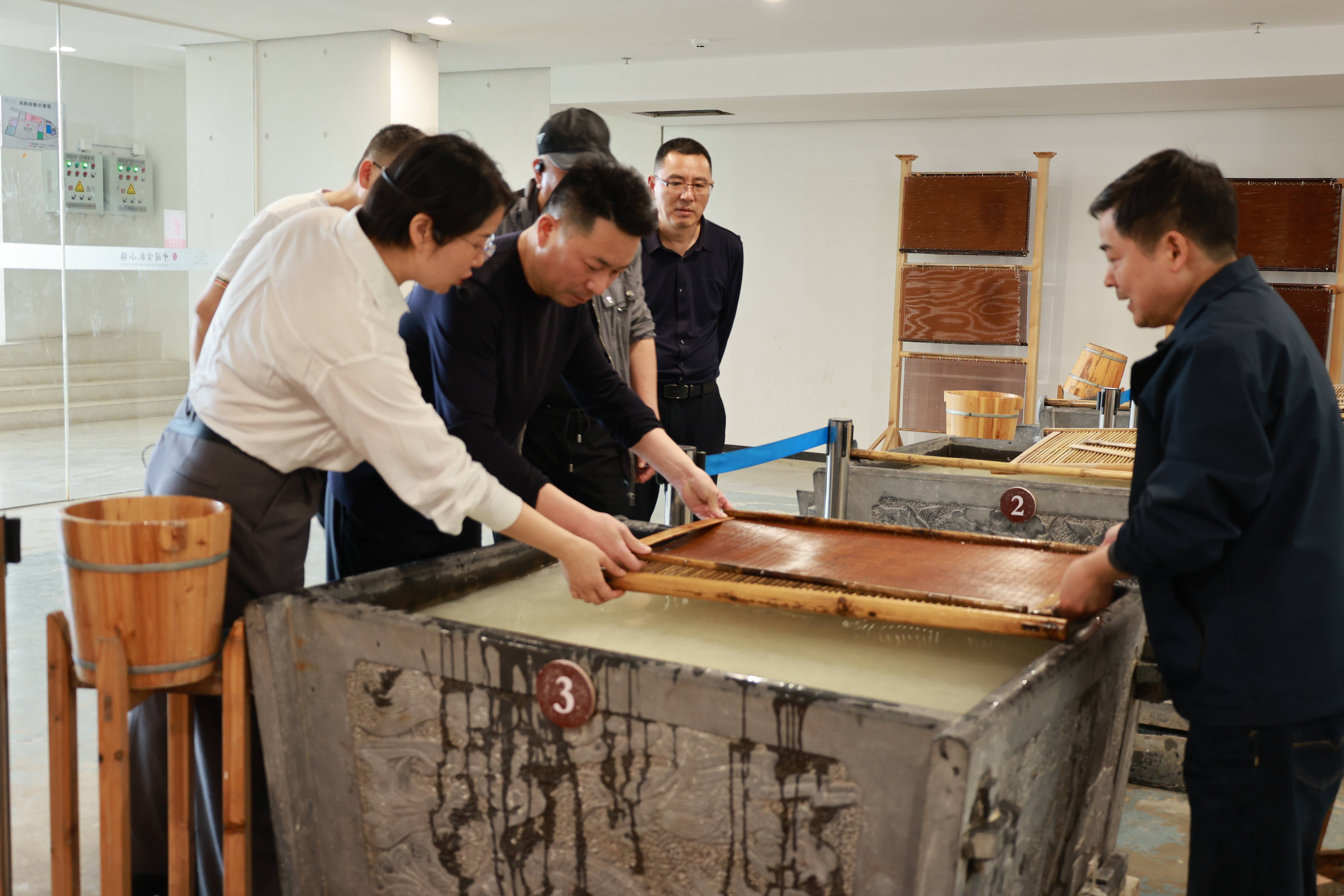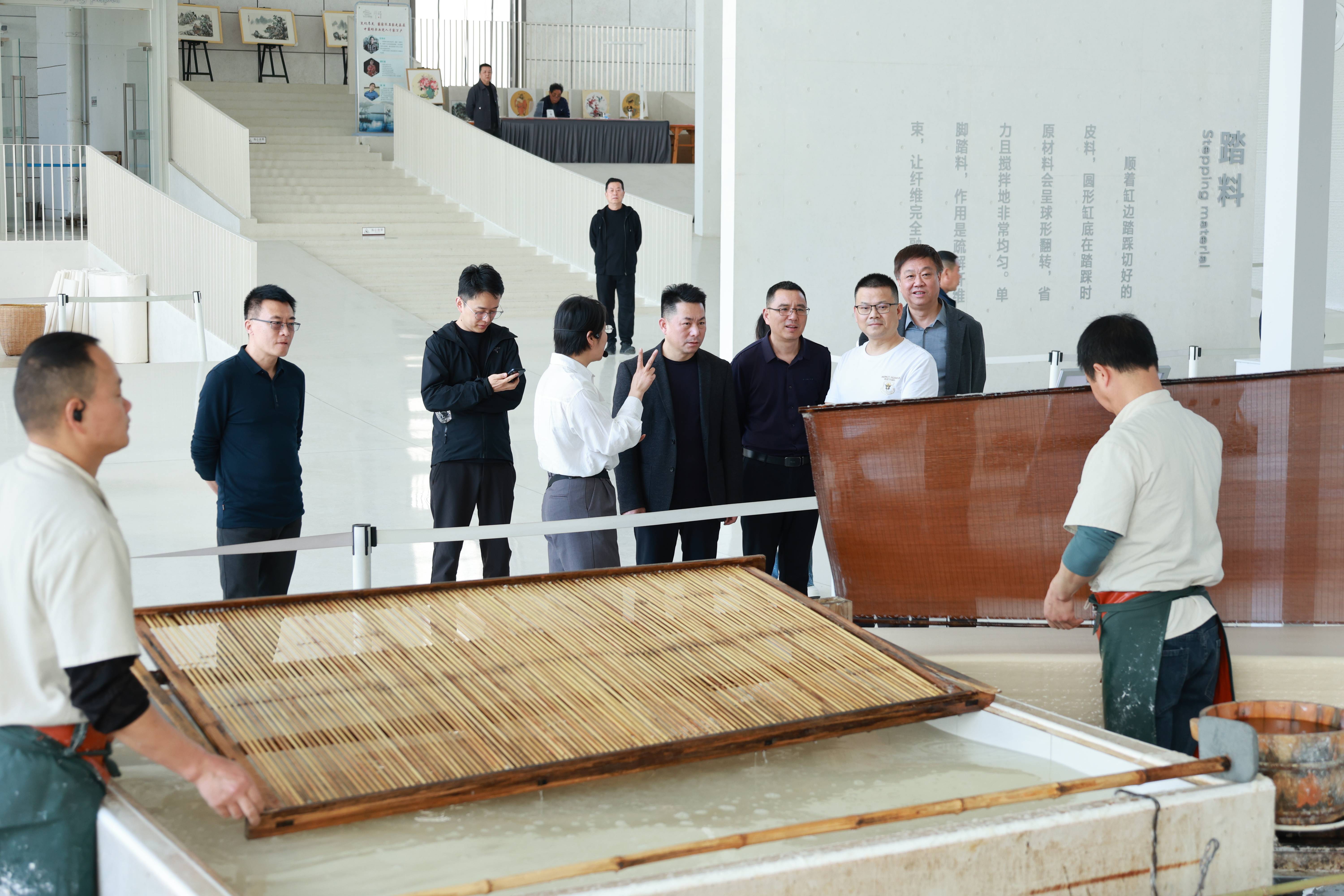 在文化园的国纸客厅,嘉宾们观看了宣纸制作的捞、晒、剪工艺,还亲自体验了宣纸制作技艺,深刻体会到非遗传承的不易。